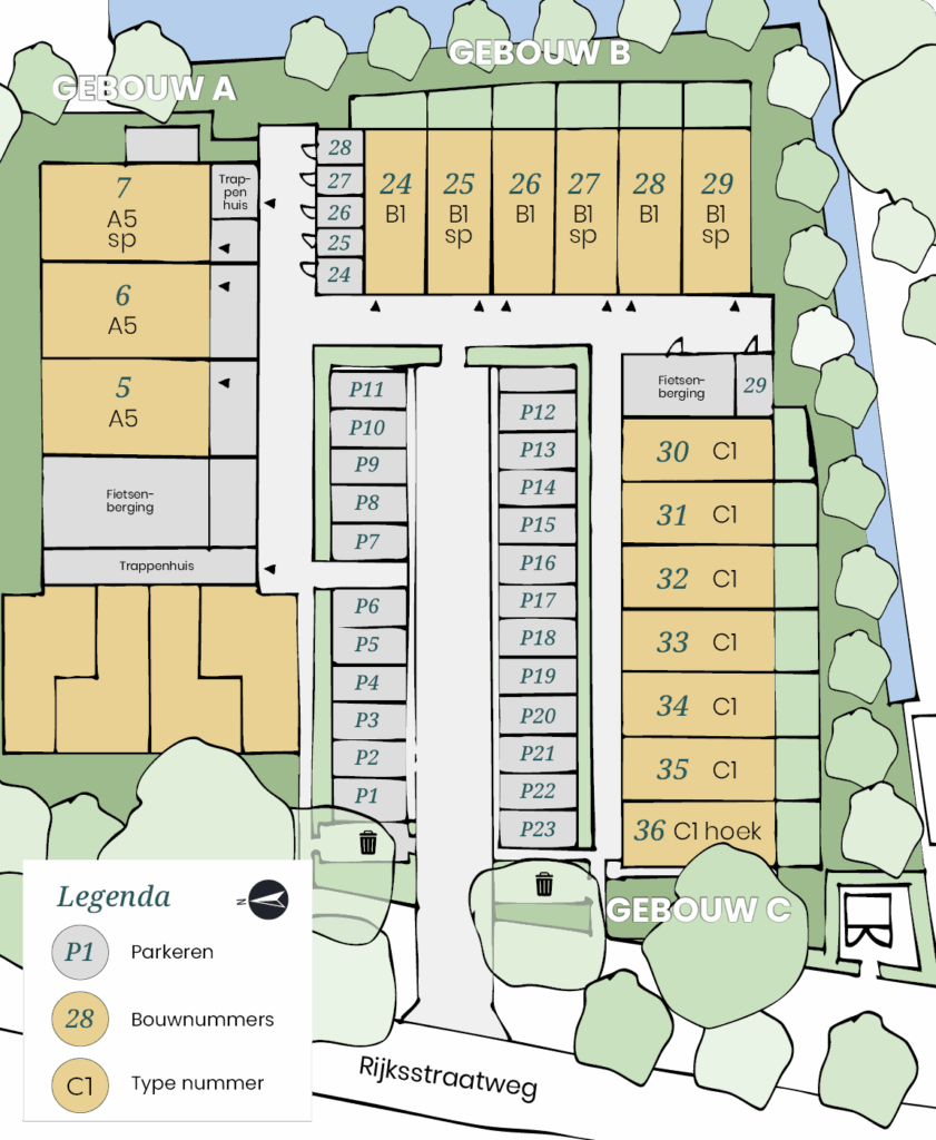 De kopers van de eengezinswoningen (type B en C) krijgen de mogelijkheid een eigen parkeerplaats te kopen bij de woning.